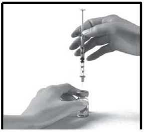 3. Snu hetteglasset og sprøyten opp ned. Med nålen i oppløsningen, trekkes stemplet ut for å trekke opp korrekt dose i sprøyten.