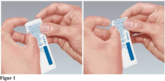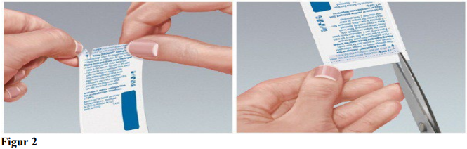 Alternativt kan doseposen klippes opp med saks langs pilen (se figur 2).