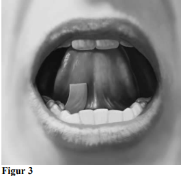 Drikk vann for å fukte munnen først. Dette gjør at filmen lettere løses opp. Hold en film mellom to fingre i ytterkantene, og legg filmen under tungen, innerst på venstre eller høyre side (se figur 3).