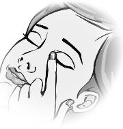 6. Bøy hodet bakover eller legg deg ned. Legg hånden på pannen din. Pekefingeren skal være på linje med øyebrynet eller hvile på neseroten. Vær spesielt forsiktig med å ikke la flasketuppen berøre øyet, huden rundt øyet eller fingrene. Dette for å forhindre mulig forurensing av oppløsningen. |
