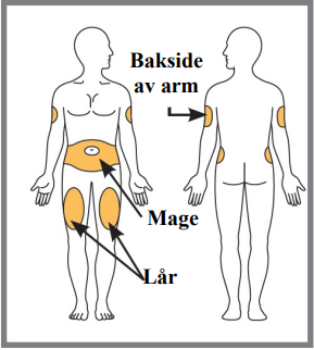 IKKE injiser i områder der huden er tynn, har blåmerker, er rød eller hard, eller der du har arr eller strekkmerker. IKKE injiser nærmere enn 2,5 cm fra navlen.