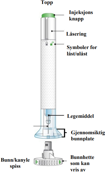 IKKE sett bunnhetten på igjen. Kast den ferdigfylte pennen i en kanylebøtte eller som anvist av lege, apotek eller sykepleier.