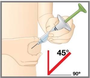 Stikk kanylen inn med 45 graders vinkel. Slipp forsiktig taket i huden. Sørg for å holde kanylen på plass. |