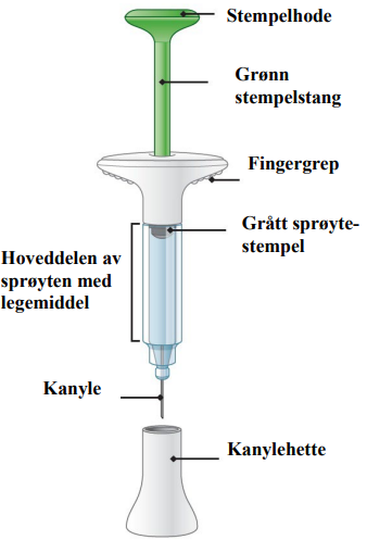 Legemidlet inne i sprøyten skal være en klar løsning. Fargen kan variere fra fargeløs til svakt gul.