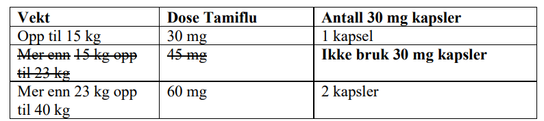 Pasienter som ikke kan svelge kapsler: Kommersielt tilberedt Tamiflu mikstur (6 mg/ml) er det foretrukne legemidlet for barn og voksne som har vanskeligheter med å svelge, eller når det er behov for lavere doser. Hvis Tamiflu pulver til mikstur ikke er tilgjengelig, kan apoteket tilberede en mikstur (6 mg/ml) fra Tamiflu kapsler. Hvis apotekfremstilt mikstur ikke er tilgjengelig, kan pasientene tilberede mikstur fra kapsler i hjemmet.