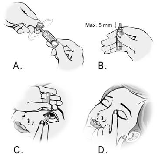 Legg hodet bakover, eller legg deg ned. Legg hånden på pannen. Pekefingeren skal plasseres langs øyebrynet eller hvile på neseroten. Se opp. Trekk nedre øyelokk nedover med den andre hånden. Pass på at ikke noen del av beholderen kommer i kontakt med øyet eller området rundt. Trykk forsiktig på beholderen og la det falle ned én dråpe i rommet mellom øyet og øyelokket. (bilde C)