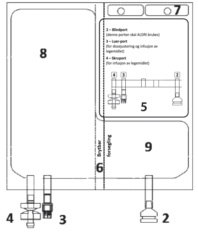 Etter rekonstituering inneholder posen en klar og fargeløs infusjonsvæske, oppløsning.