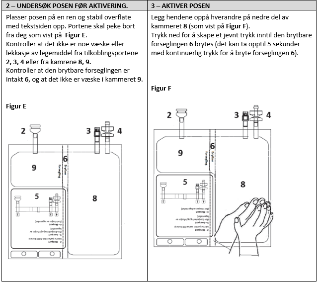 Den endelige rekonstituerte oppløsningen oppnås etter anbrudd av den brytbare forseglingen på posen med to kammer, og blanding av innholdet (pulver og oppløsningsvæske) inntil pulveret er løst fullstendig opp.