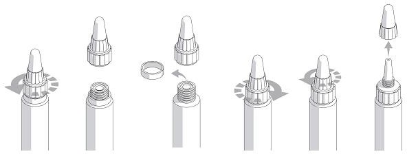 Tuben er forseglet. Før første gangs bruk må du skru av hele tubespissen, og fjerne den løse ringen. Skru tubespissen fast til igjen, slik at forseglingen i tuben brytes. Tuben er da klar til bruk, ved at den øverste tubespissen skrus av.