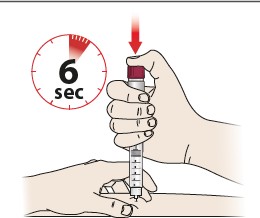 Trykk ned doseringsknappen (6) så mye som mulig og hold den inne i minst 6 sekunder for å sikre at hele dosen blir injisert – Du vil høre en klikkelyd når du begynner å trykke ned doseringsknappen. Dette er normalt.