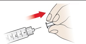 Fest en kanyle. Du vil se at det kommer ut noen dråper. Pennen er nå klar for bruk igjen. Still inn dosen og injiser. |
