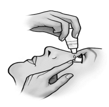 3. Dra nedre øyelokk nedover og se opp. Trykk lett på flasken til det faller en dråpe ned i øyet.