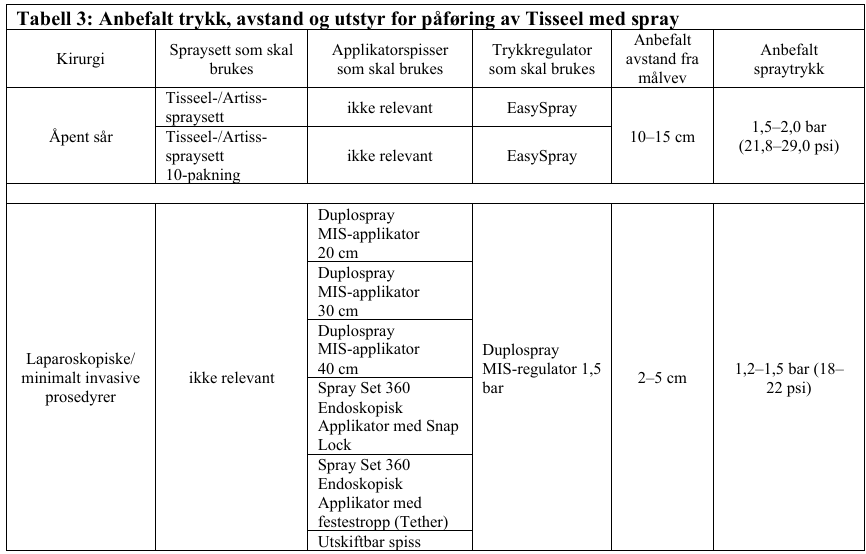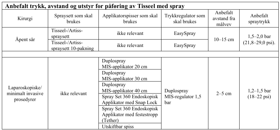 Når Tisseel påføres med sprayutstyr, må det benyttes et trykk og en avstand fra vev som er innenfor områdene som anbefales av produsenten, som følger: