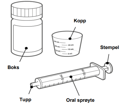 En doseringskopp og en oral sprøyte følger med i pakningen.