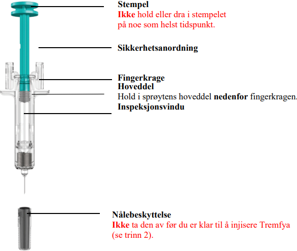 Tremfya ferdigfylt sprøyte er tiltenkt injeksjon under huden, ikke i en muskel eller blodåre. Etter injeksjon vil nålen trekkes inn i enheten og låses på plass.