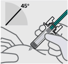 Bruk den andre hånden til å klemme sammen huden på injeksjonsstedet. Plasser sprøyten i ca. 45 graders vinkel mot huden.