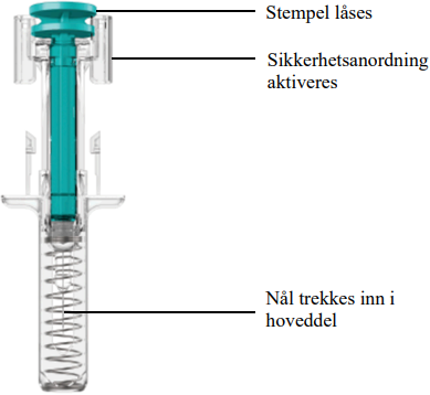 Sikkerhetsanordningen vil dekke nålen og låses på plass, slik at nålen trekkes ut av huden.