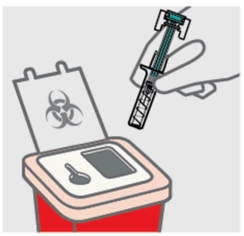 Legg den brukte ferdigfylte sprøyten i en beholder for skarpe gjenstander umiddelbart etter bruk.