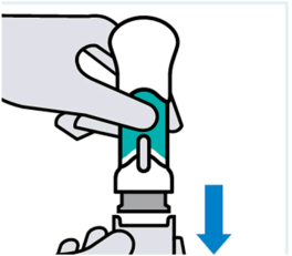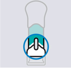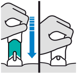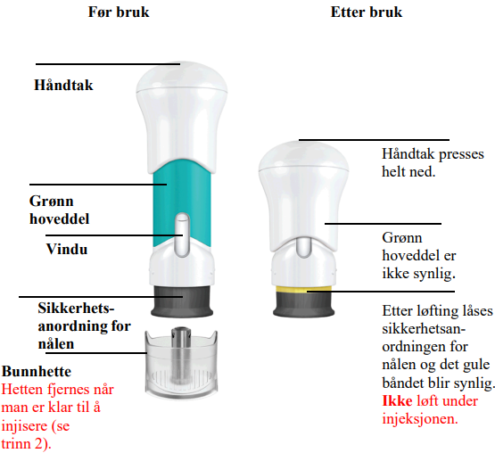 Under injeksjonen presses håndtaket helt ned til grønn hoveddel ikke er synlig, for å injisere hele dosen.