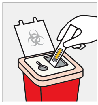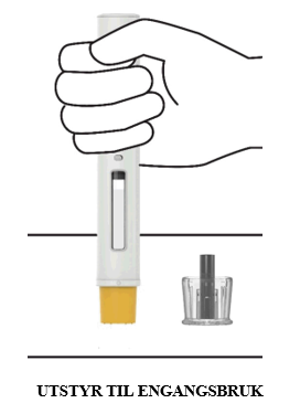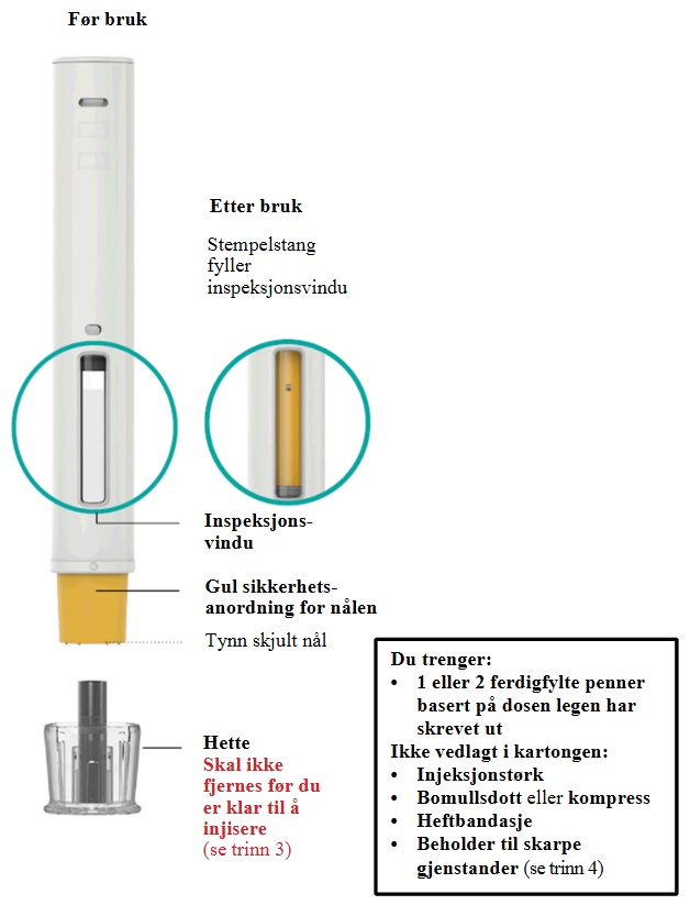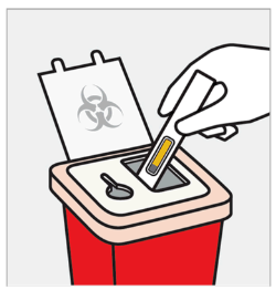 Legg den brukte ferdigfylte pennen og hetten i en beholder for skarpe gjenstander umiddelbart etter bruk.