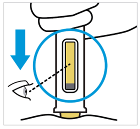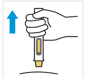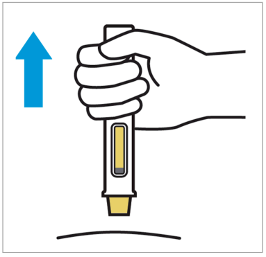 Plasser den ferdigfylte pennen rett på injeksjonsstedet med nålens gule sikkerhetsanordning mot huden og inspeksjonsvinduet mot deg.
