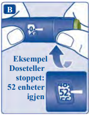 Se alltid på dosetelleren for å følge med på hvor mange enheter du injiserer.Dosetelleren vil vise nøyaktig antall enheter. Ikke tell penneklikkene. Hold doseknappen inne inntil dosetelleren går tilbake til 0 etter injeksjonen. Hvis dosetelleren stopper før den går tilbake til 0, har ikke hele dosen blitt injisert. Dette kan føre til for høyt blodsukkernivå.