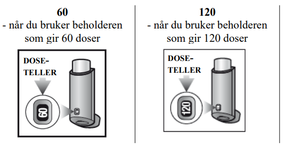Det er en teller på baksiden av inhalatoren som forteller deg hvor mange doser det er igjen. Hver gang du trykker ned trykkbeholderen, frigis en dose av legemidlet, og telleren teller ned med én. Vær forsiktig så du ikke lar inhalatoren falle (ved at du for eksempel mister eller kaster den) – det kan få telleren til å telle ned.