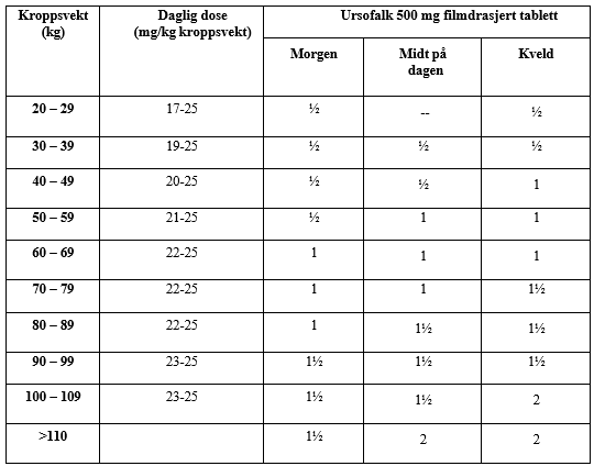 I de 3 første månedene etter at behandlingen er påbegynt bør inntak av Ursofalk fordeles utover dagen. Når leververdiene er forbedret kan dosen tas én gang daglig, fortrinnsvis om kvelden.