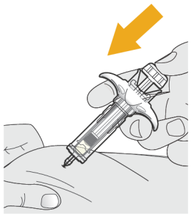 Når stempelet er så langt ned som det kan gå, fortsett å trykke på stempelhodet mens du drar ut kanylen og slipper huden.