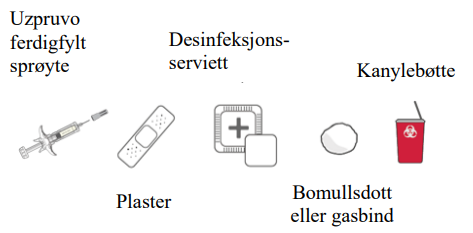 Desinfeksjonsservietter, bomullsdotter eller gasbind og emballasje kastes som ordinært avfall.