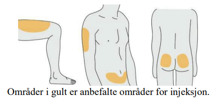Bruk et nytt injeksjonssted for hver injeksjon. Ikke sett en injeksjon i et område av huden som er ømt, som har blåmerker, som er rødt eller hardt.