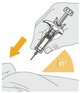 Bruk en rask, pil-lignende bevegelse for å sette kanylen inn i huden som er knepet sammen i en vinkel på omtrent 45 grader (se figur 6).