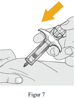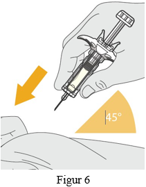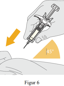 Bruk en rask, pil-lignende bevegelse for å sette kanylen inn i huden som er knepet sammen i en vinkel på omtrent 45 grader (se figur 6).
