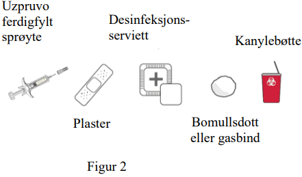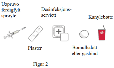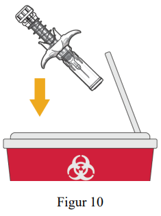 Kast brukte sprøyter umiddelbart etter bruk i en punkturresistent beholder, f.eks. en kanylebøtte i henhold til lokale retningslinjer. Ikke kast løse sprøyter i husholdningsavfallet (se figur 10).