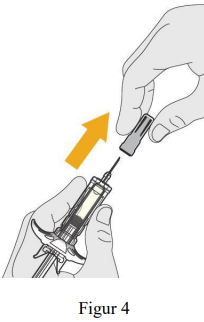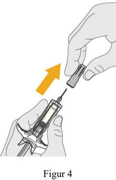 Hold sprøytesylinderen til den ferdigfylte sprøyten i én hånd, og trekk kanylehetten rett av (se figur 4).