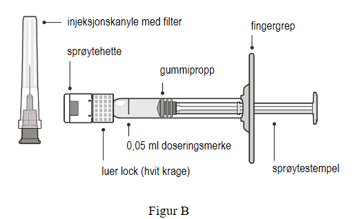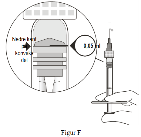 8. Hold sprøyten i øyehøyde og trykk langsomt på sprøytestempelet til den nedre kanten på gummiproppens konvekse del er på linje med doseringsmerket 0,05 ml (se Figur F). Dette vil fjerne luften og overflødig legemiddel og klargjøre dosen på 0,05 ml.