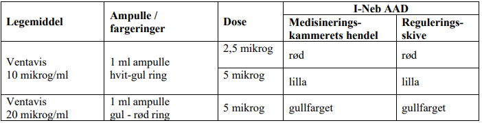 Siden I-Neb AAD-systemet kan brukes for Ventavis 10 mikrogram/ml og Ventavis 20 mikrogram/ml, viser tabellen under et sammendrag av bruksanvisningen for I-Neb for de to Ventavis-konsentrasjonene: