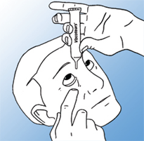 Trekk det nederste øyelokket nedover med en finger. Hold tuben loddrett i den andre hånden med spissen nedover – derved dannes en liten dråpe på spissen av tuben og dråpen dryppes i øyet (mellom nedre øyelokk og øyet). Pass på så ikke spissen på tuben berører noe.