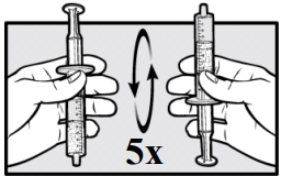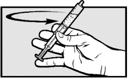 14. Med sprøytespissen pekende oppover roteres vannet rundt for å ta med evt. rester av legemidlet i sprøyten.