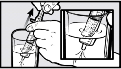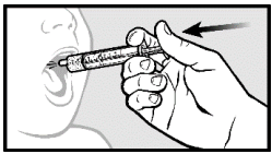 10. Sett målesprøyten inn i munnen til pasienten. Press stemplet rolig inn slik at hele volumet i målesprøyten overføres.