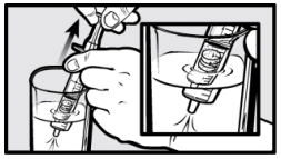 12. Sett sprøytespissen ned i glasset som er fylt med vann. Trekk opp 5 ml vann ved å trekke stemplet sakte ut.