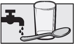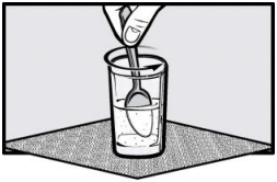 9. Fyll på glasset med samme mengde vann (ca. 25 ml). Rør om innholdet med den samme skjeen for å ta med evt. rester av legemiddel som er igjen i glasset eller på skjeen.