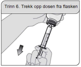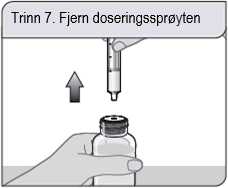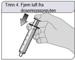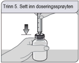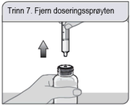 Hvis du ser luftbobler i doseringssprøyten, skyver du stempelet helt inn for å tømme oppløsningen tilbake i flasken. Deretter trekker du opp den foreskrevne dosen med oppløsning.