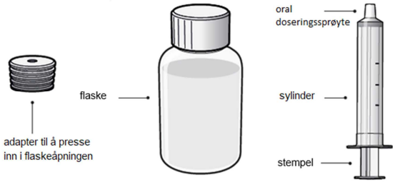 Hver pakning inneholder én HDPE-flaske, én adapter til å presse inn i flaskeåpningen og én oral doseringssprøyte med graderinger på 3,2 ml, 4 ml og 5 ml.