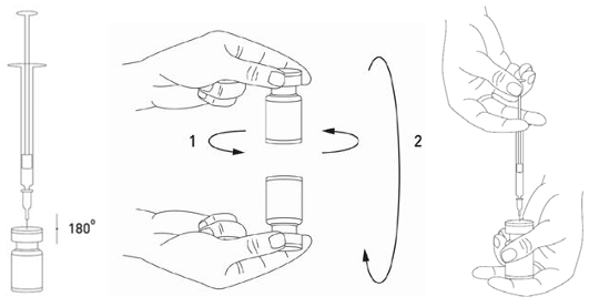 Ved behov bør nålen brukt til rekonstituering bli værende i hetteglasset og nødvendig mengde oppløsning trekkes opp med en ny steril sprøyte egnet for injeksjon.