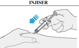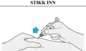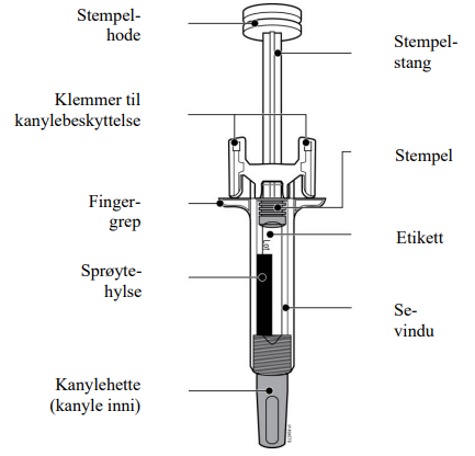 Viktig: Ta først av kanylehetten like før du skal injisere (innen 5 minutter), da dette ellers kan føre til at legemidlet tørker ut.