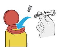Kast den brukte, ferdigfylte sprøyten og kanylehetten i beholderen for skarpe gjenstander.