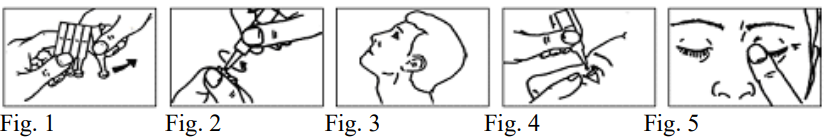Lukk øyet og press forsiktig i ca. 1-2 minutter med en finger innerst i øyekroken. På den måten forhindres øyedråpene i å renne ned i svelget via tårekanalen (fig. 5). Gjenta ved behov fra punkt 6 til 8 for det andre øyet.