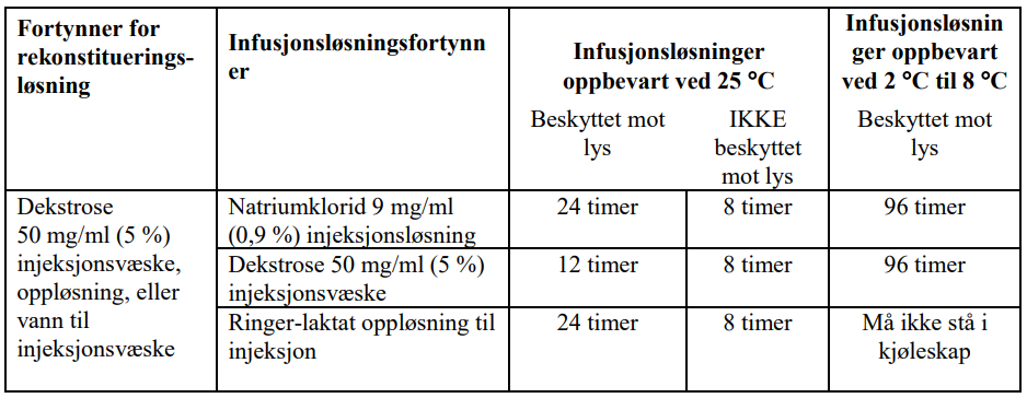De rekonstituerte- og infusjonsløsningene skal ikke fryses eller utsettes for direkte sollys.